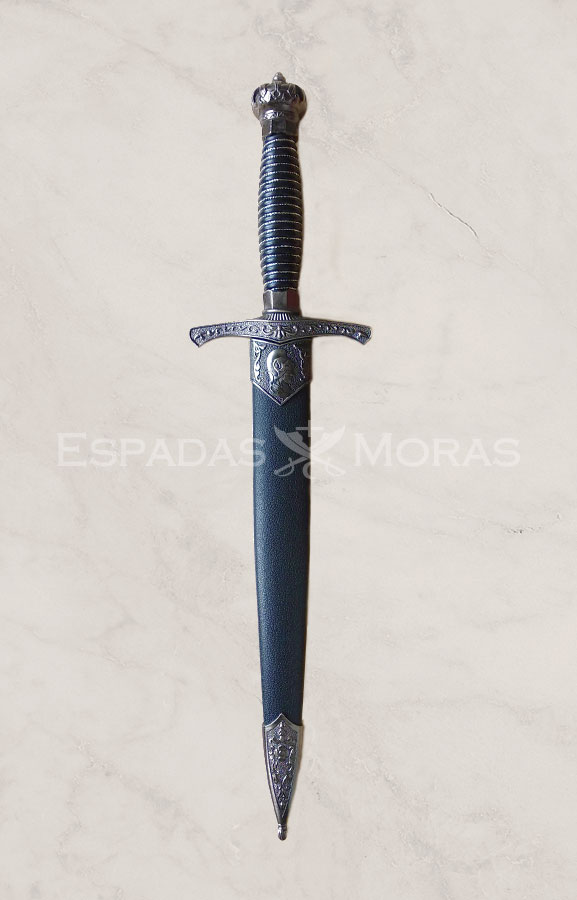 Daga de estilo tradicional con empuñadura grabada y vaina metálica a medida. Presencia sobria para colección, recreación y ambientación de época.