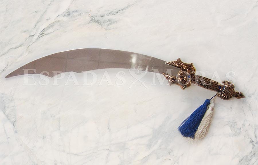 Espada árabe realizada en hoja de metal aluminio acabado brillo espejo y empuñadura de aluminio fundición, con acabado dorado y motivos arabescos. Está destinada a darle un uso decorativo y en especial para ser usada en los desfiles de las fiestas de Moros y Cristianos. Debido a su poco peso y la ergonomía de su empuñadura hace que sea muy cómoda, pudiendo ser usada por damas y caballeros.
