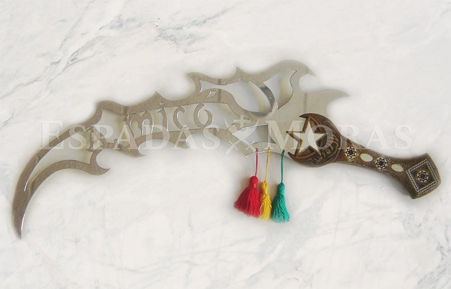 Sable moruno para uso decorativo y en especial para usar en el desfile de las fiestas de Moros y Cristianos que debido al poco peso (tan solo 760 gr. aprox.) y ergonomía de su empuñadura hace de ella que sea muy cómoda, pudiendo ser usada por damas y caballeros.
