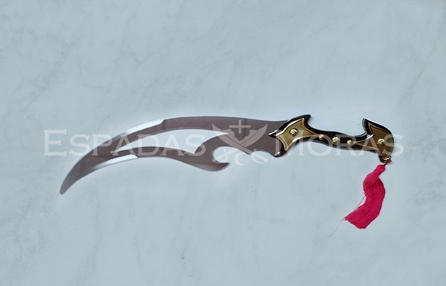 La espada Saifac está fabricada en aluminio pulido y destaca por su hoja curvada, estilizada y brillante, que aporta elegancia en cada movimiento.