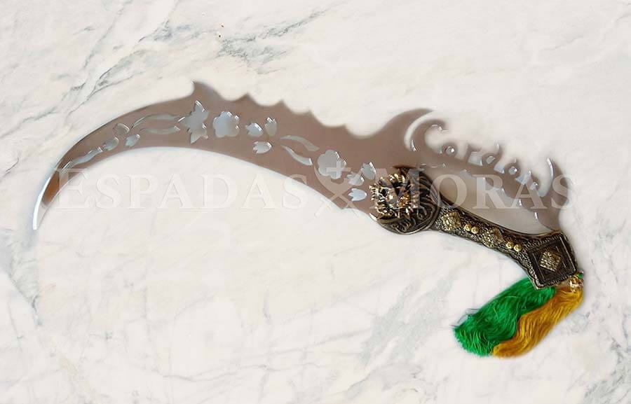 Espada realizada en hoja de metal aluminio con motivo floral calado realizado a mano, acabado brillo espejo y la empuñadura de resina con recubrimiento de metal oro envejecido e incrustaciones de latón pulido con motivos arabescos.
